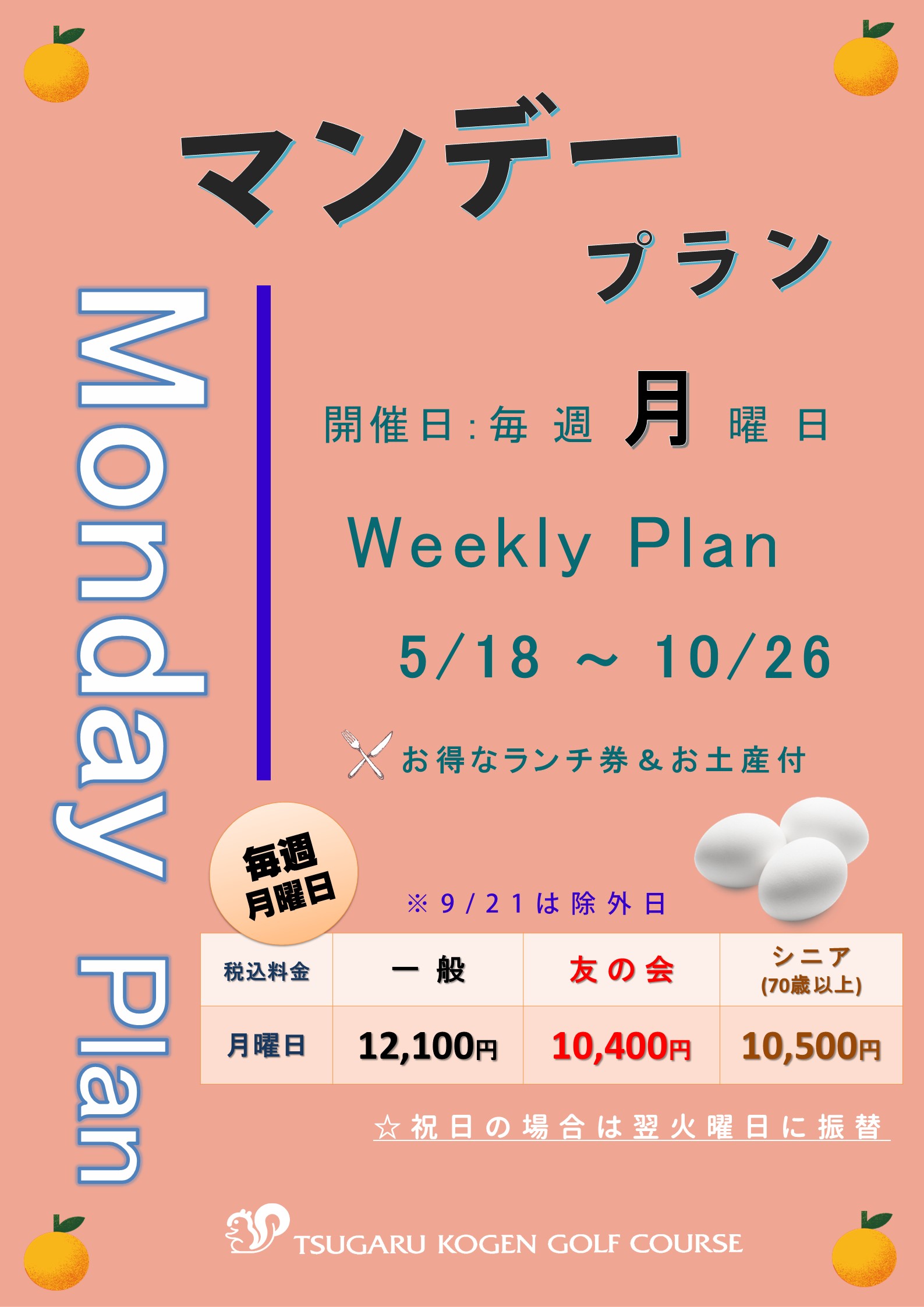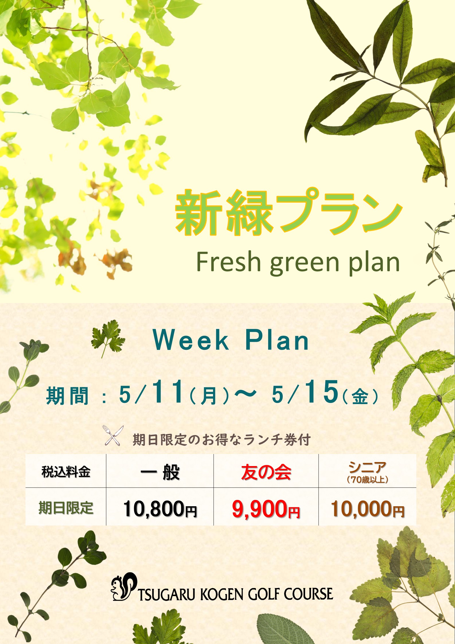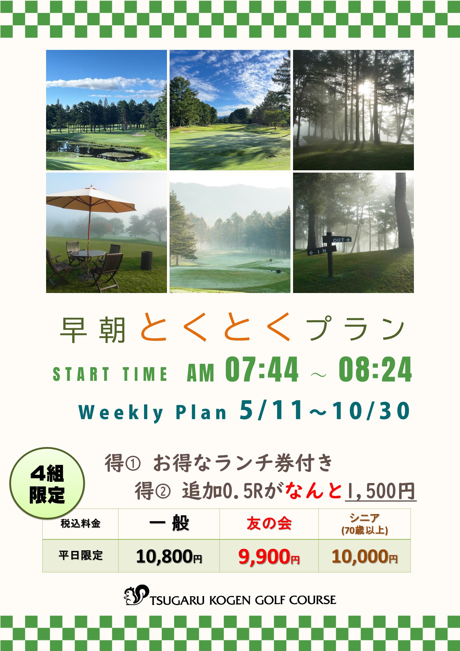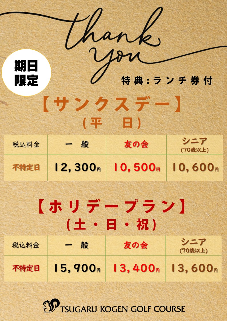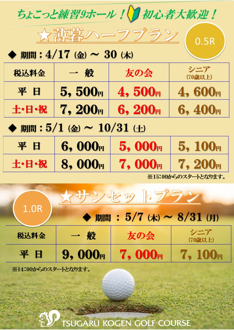 ※ゴルフ利用税は、4/17~30まで450円、5/1~10/31まで550円、11/1~8まで450円、11/9~15まで400円となります。