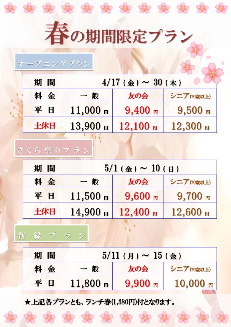 ※各企画プラン日にご利用の場合は、企画プラン料金となります。